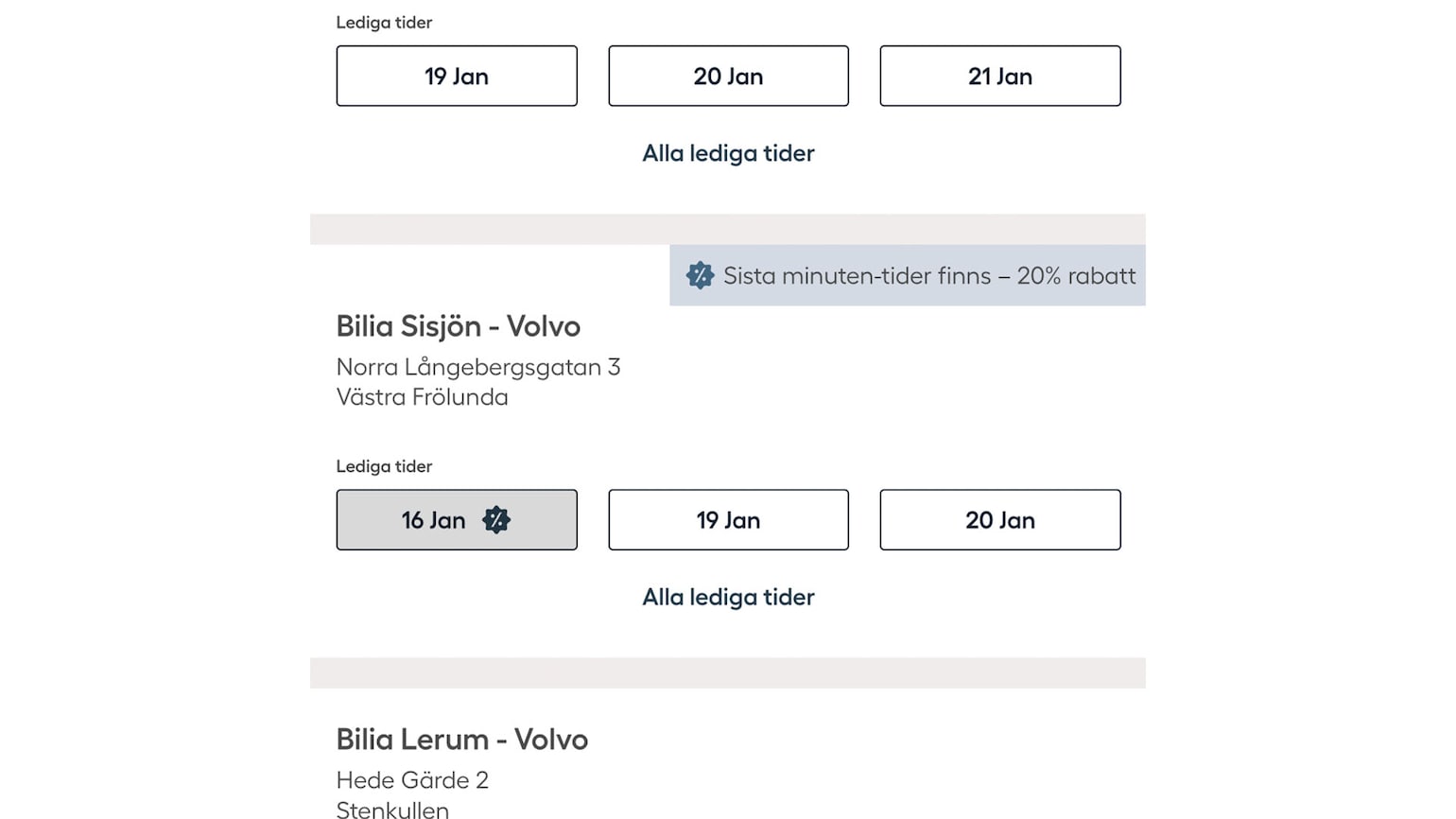 Sista minuten-service gäller inte Volvo classic service (6 år eller äldre), Bilia BMW Service (5 år eller äldre), Bilia MINI Service (4 år eller äldre), Toyota trygghetsservice (10 år eller äldre), Mercedes-Benz FairPrice-service (4 år eller äldre), Volkswagen Originalservice 4+, Originalservice 8+ och Basservice, Audi Originalservice 4+, Originalservice 8+ och Basservice, Renault Optimalservice (5 år eller äldre), Skoda Originalservice 4+, Originalservice 8+ och Basservice, CUPRA Originalservice 4+, SEAT Originalservice 4+, Originalservice 8+ och Basservice, Nissan ekonomiservice (5 år eller äldre), Lexus Trygghetsservice (8 år eller äldre). Sista minuten-tider till 20% rabatt gäller endast arbetskostnad på en service och går inte att kombinera med andra rabatter och avtal.